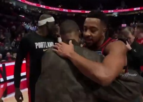 赛后,此役重回波特兰的麦科勒姆与老队友利拉德相拥致意。