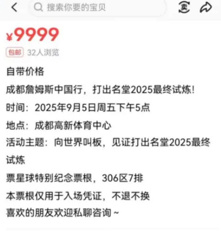 这种质疑不是空穴来风。有媒体报道,在闲鱼等第三方平台上,詹姆斯中国行活动门票最高已被炒至9999元。此外还有大量售价1000元以上的门票。