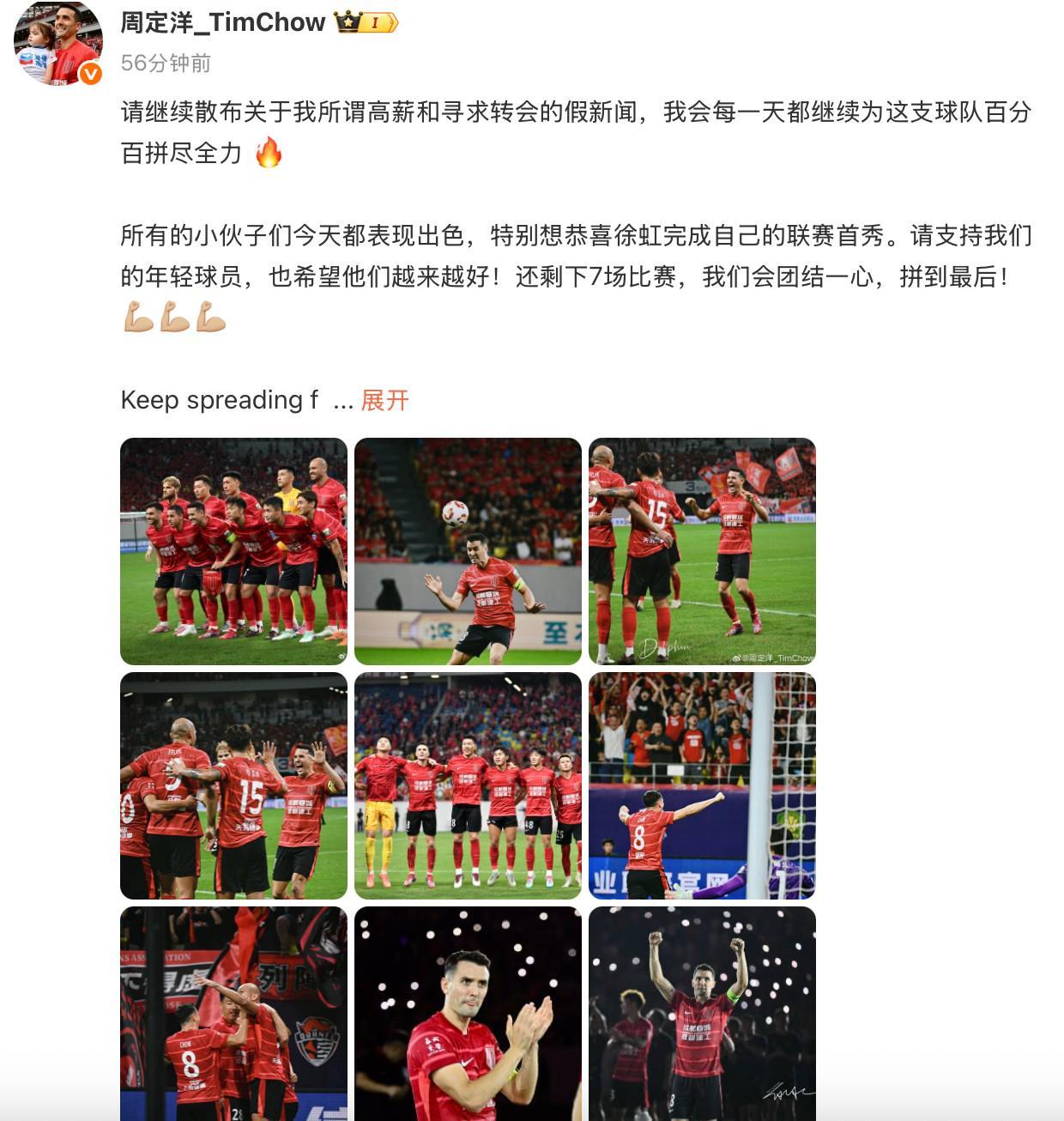 在比赛后,周定洋在社交媒体上写道:请继续散布关于我所谓高薪和寻求转会的假新闻,我会每一天都继续为这支球队百分百拼尽全力 所有的小伙子们今天都表现出色,特别想恭喜徐虹完成自己的联赛首秀。请支持我们的年轻球员,也希望他们越来越好!还剩下7场比赛,我们会团结一心,拼到最后!