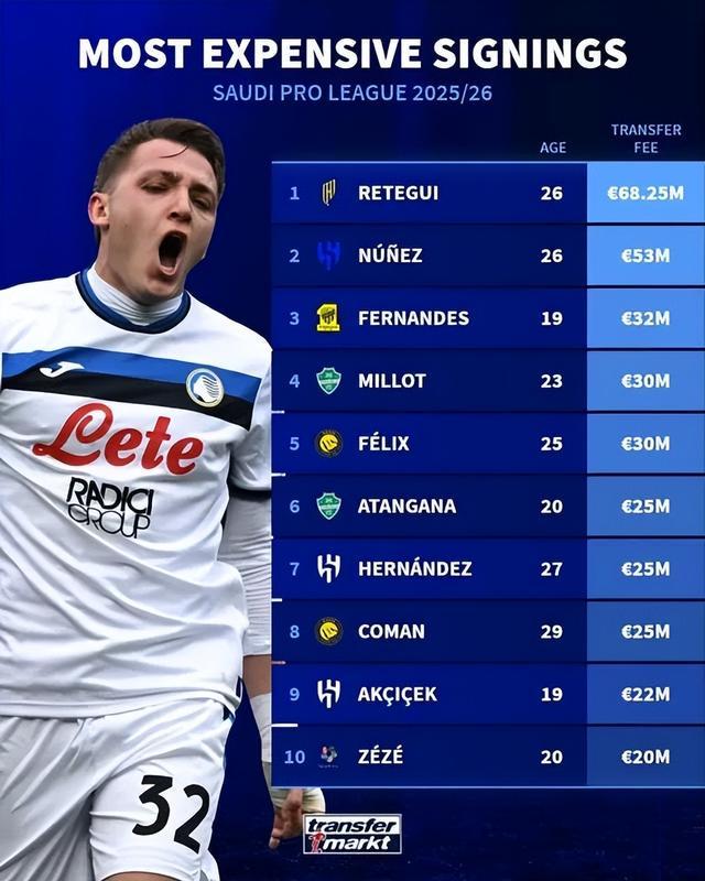 本赛季沙特联赛的“标王”,是意大利归化前锋雷特吉,其转会费为6825万欧元;其他名气稍显突出的球员,仅有转会费5300万欧元的努涅斯、3500万欧元的西马坎、3000万欧元的菲利克斯与米洛、2500万欧元的特奥和科曼,以及以自由身加盟的拉卡泽特、伊尼戈・马丁内斯。