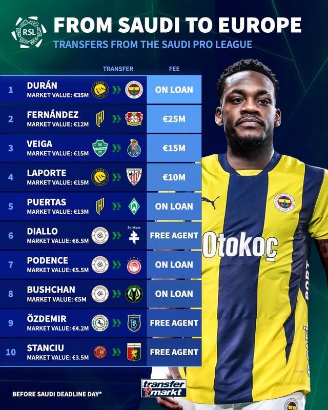 利雅得胜利的哥伦比亚中锋杜兰,曾以7700万欧元的转会费创下队史纪录,在沙特联赛历史上也仅低于内马尔的9000万欧元;若算上1500万欧元的浮动条款,他本有望成为新的联赛“标王”。但令人意外的是,仅在利雅得胜利效力半年后,杜兰便在今夏被租借至土超豪门费内巴切。