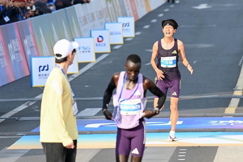 在男子组的竞争中,马瑞在15公里处脚部磨破的情况下,硬是靠着意志力拼到终点,最终以1小时02分49秒的成绩斩获男子国内冠军,刷新个人半马PB的同时,也创造了这条赛道的国内男子选手最好成绩。
