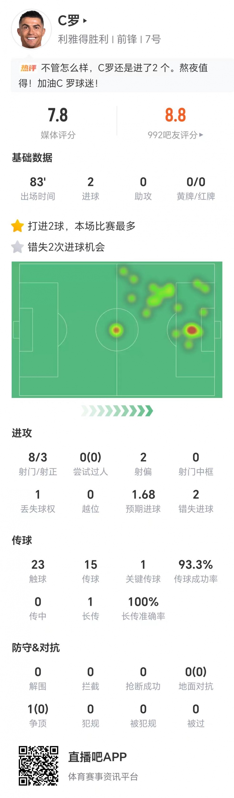 赛后技术统计数据显示,C罗本场比赛8射3正,无过人,两次错失进球,1次关键传球,获评7.8分。